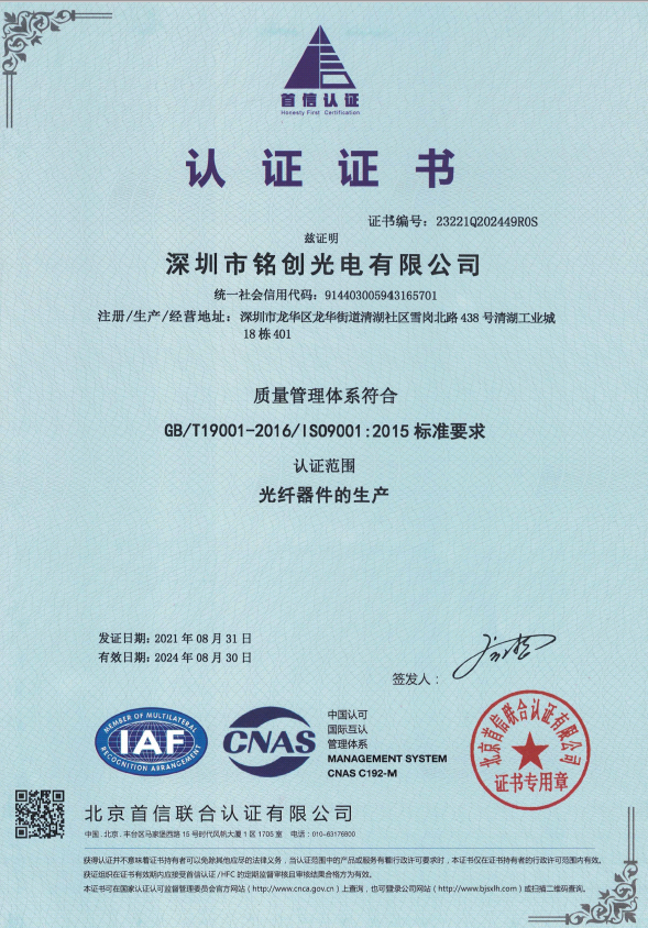 深圳市銘創光電有限公司于2012年成立,公司總部位于深圳市光明區,是一家國家級高新技術企業,通過了IS09001-2015質量管理體系認證和IS014001-2015環境管理體系認證;經過多年的持續研發投入和專注發展,銘創光電已逐漸成為光纖激光器、光纖傳感、激光雷達和激光通信等領域的綜合性產品服務商。 公司目前設立有光無源器件研發生產中心和激光研發生產中心。無源器件研發生產中心設有有高標準的無塵車間,可提供各種波長的無源光纖器件、高功率光纖器件、保偏光纖產品、超小型光纖器件。激光研發中心建立在安徽合肥市,研發生產特殊波長的激光光源、光纖激光器、光纖放大器以及新產品的技術研究儲備。研發生產中心與多地科研單位合作,能夠迅捷高效的為客戶提供相